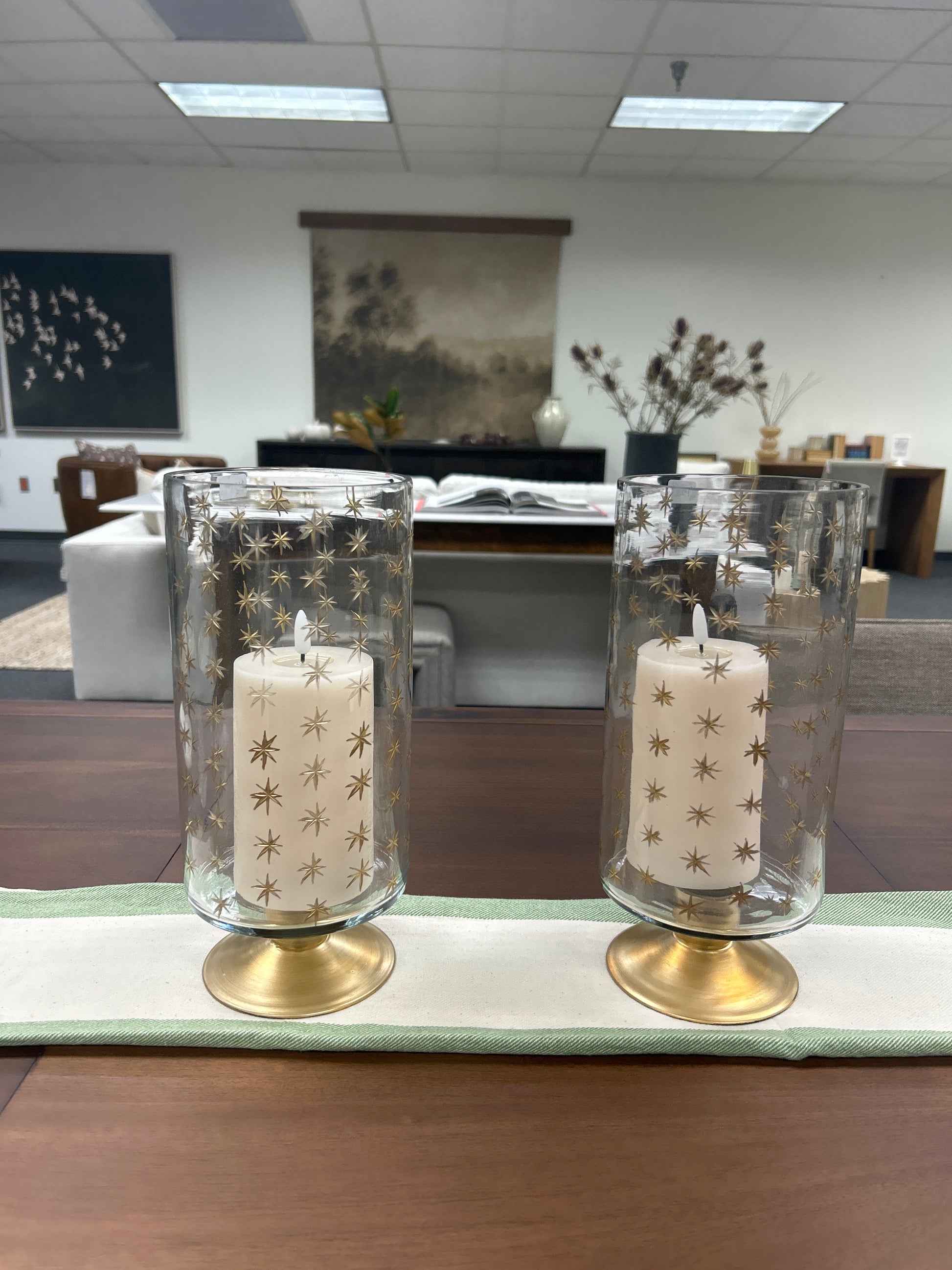Hand-Painted Etched Glass Footed Hurricane with Starburst Pattern